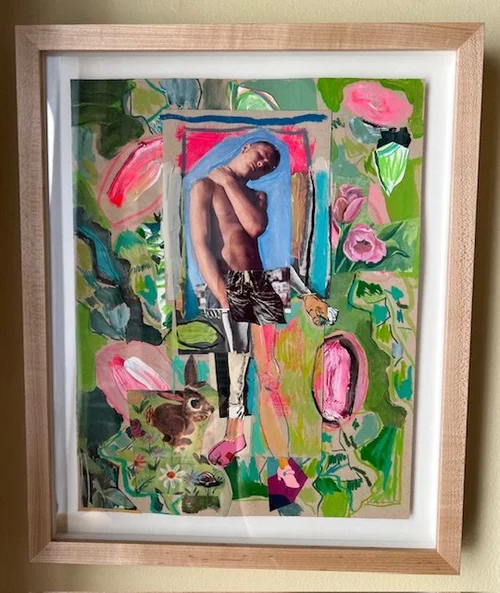 Pink Bunny, 2025, collage and mixed media on paper, 19 x 15 framed, $1,100