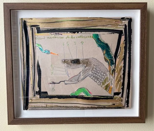 Poison Mechanism of the Rattlesnake, 2025, collage and mixed media on paper, 16 3⁄8 x 14 1⁄8 framed, $975